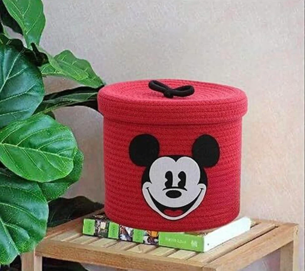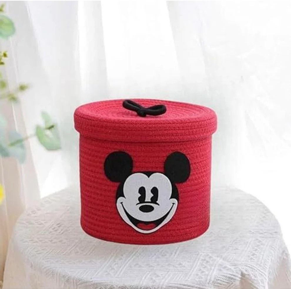 Mickey Cartoon Storage Basket – Round Rope Organizer with Lid for Toys & Clothes